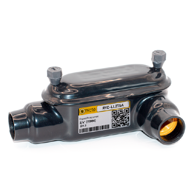 Caja de conexiones uso intemperie serie ovalada tipo (C, LB, LL, LR, T, TB, X) de aluminio libre de cobre S7™, de (especifique diámetro, ej.: 3/4”Ø), con recubrimiento exterior de PVC e interior con uretano amarillo, incluye tapa y tornillos de acero encapsulados con uñas de sujeción recubiertas con uretano amarillo, marca REPSA Yellow Coat®.